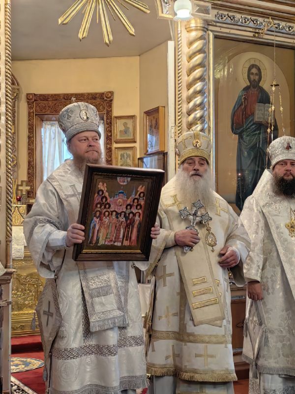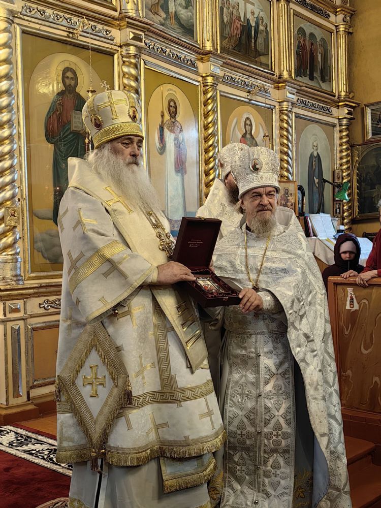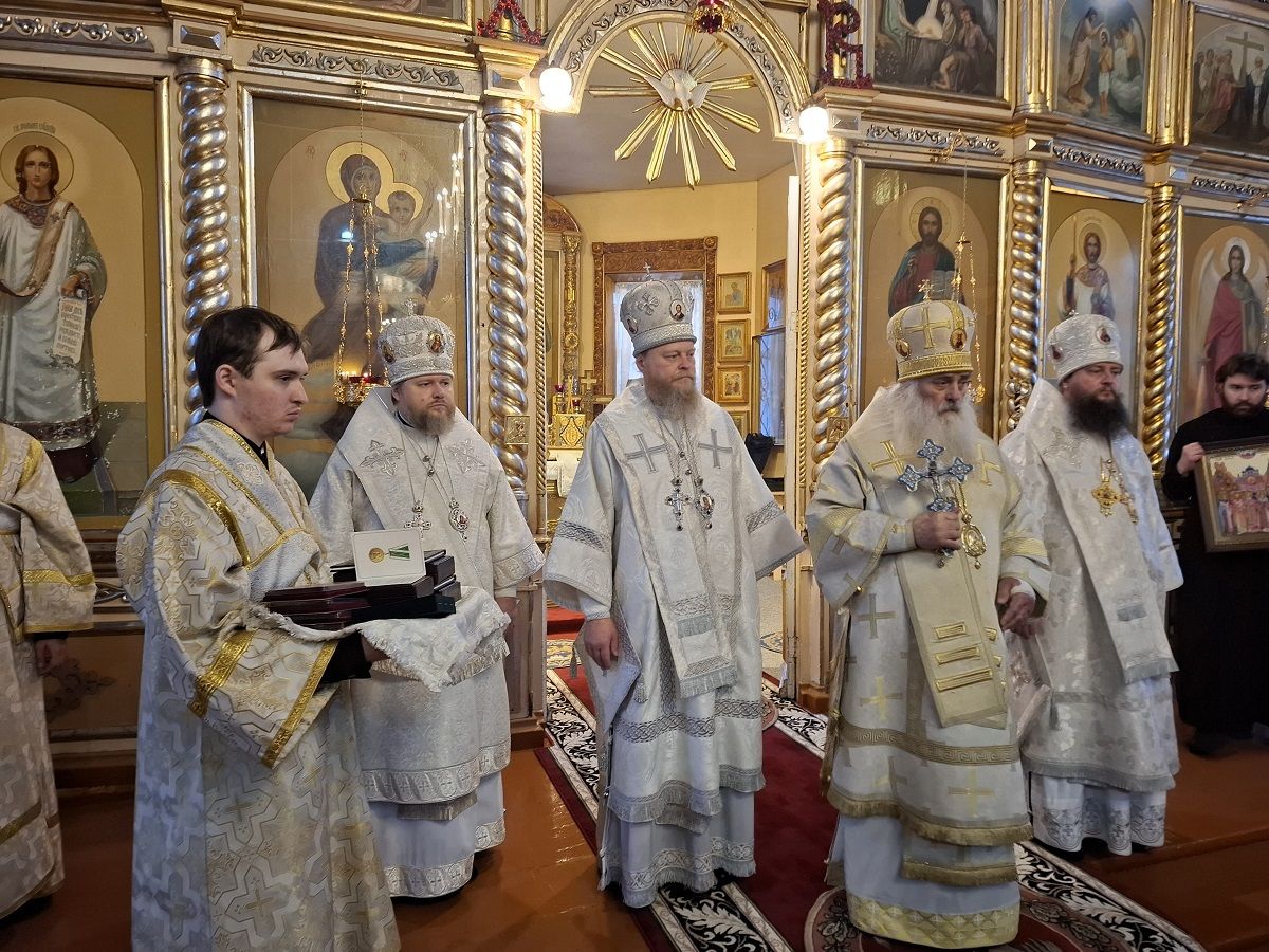 Далее архипастыри обратились к молящимся со словами поздравления. Сугубые поздравления в этот день принимали секретарь Рубцовской епархии протоиерей Михаил Кизюн и прочие именинники. Митрополит Сергий вручил отцу Михаилу драгоценный образ святителя Николая Чудотворца. К памятной дате владыка Сергий также передал в дар Михайло-Архангельскому храму образ Собора Алтайских святых.