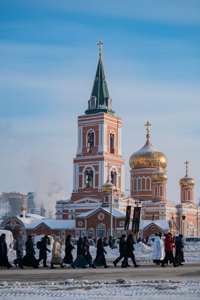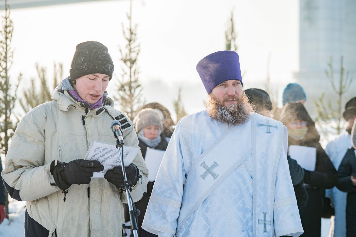 На берегу Оби городские власти построили снежную часовню, а прямо на льду реки расчистили от снега просторную площадку, огородили ее снежным валом и елочками. На площадке поставили большой ледяной крест выше человеческого роста, во льду прорубили в виде креста иордань для освящения воды, а неподалеку построили купель в виде деревянных ступенек, сходящих в воду, с перилами, для купания в крещенской воде. На месте в целях обеспечения безопасности дежурили спасатели. Рядом с купелью поставили две синие будки для переодевания братьев и сестер, желающих совершить погружение. Кроме священнослужителей, выстроившихся на льду двумя шеренгами, здесь присутствовали хоругвеносцы, журналисты, казаки, врачи и сотрудники полиции. Остальные участники крестного хода в целях безопасности остались на берегу.