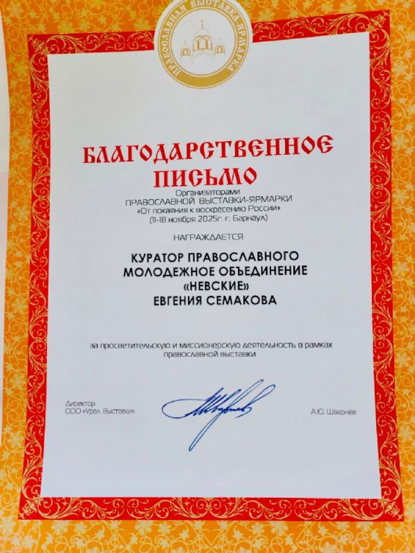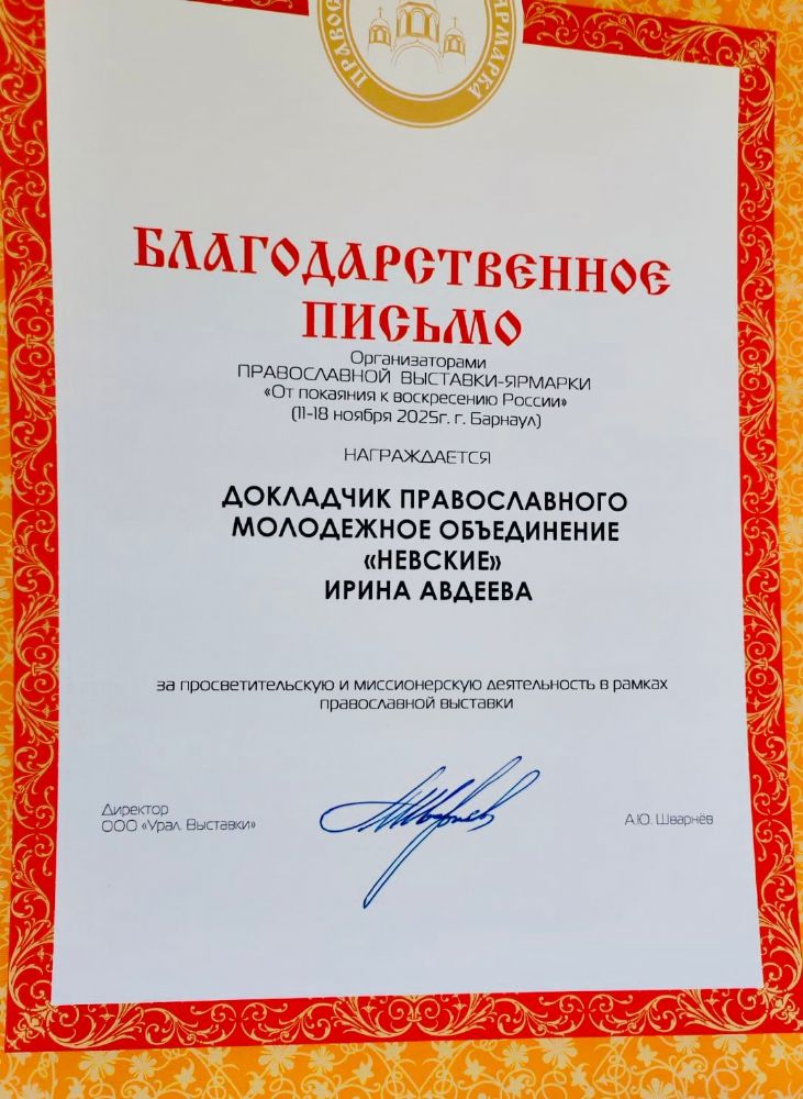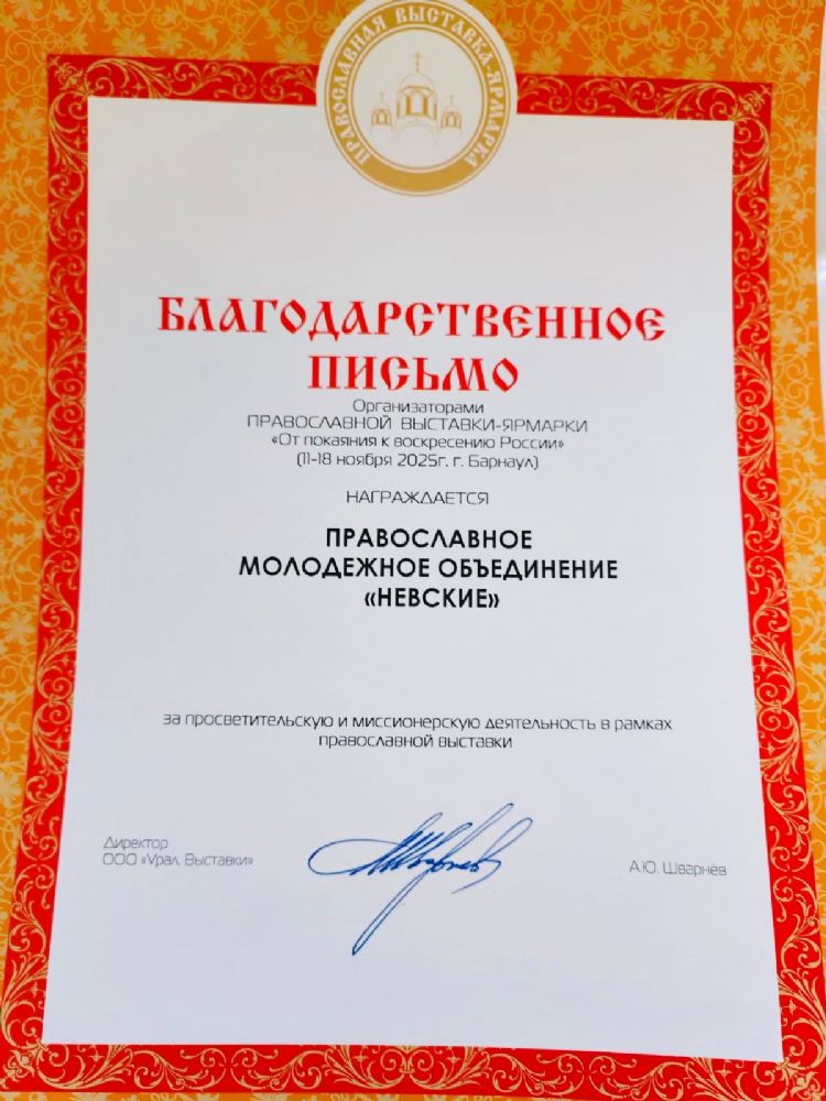 15 ноября 2025 года, по благословению настоятеля Александро-Невского собора города Барнаула и действительного члена Алтайского отделения ИППО, протоиерея Андрея Басова, молодёжный центр «Невские» приняли участие в культурной программе уральской православной выставки-ярмарки «От покаяния к воскресению России».