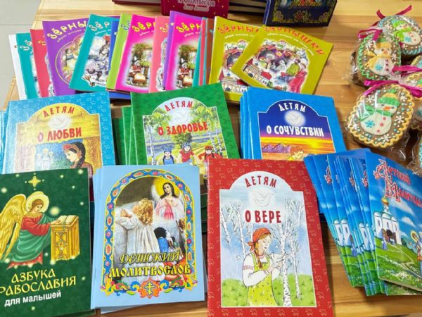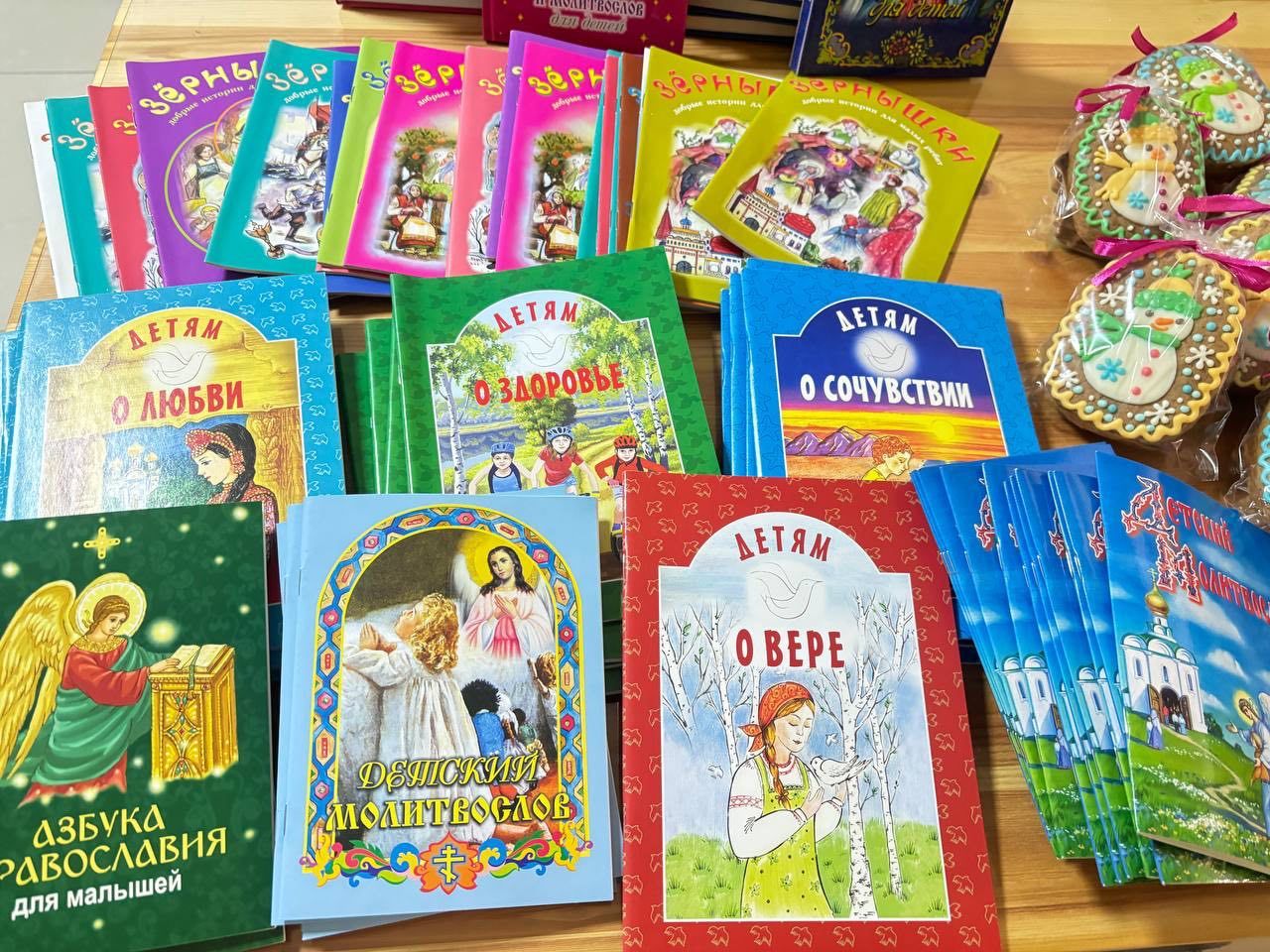 Гостям было предложено чаепитие с угощениями. Каждой семье вручили детскую православную литературу и сладкие подарки.