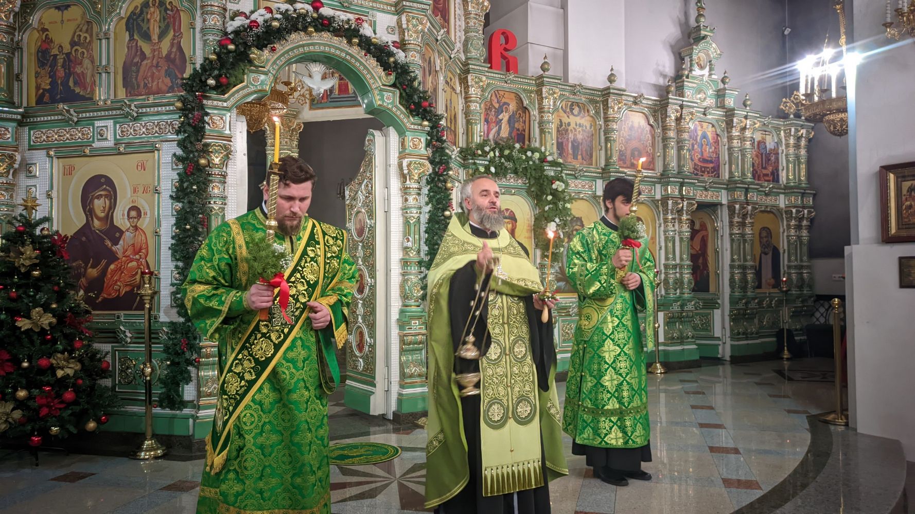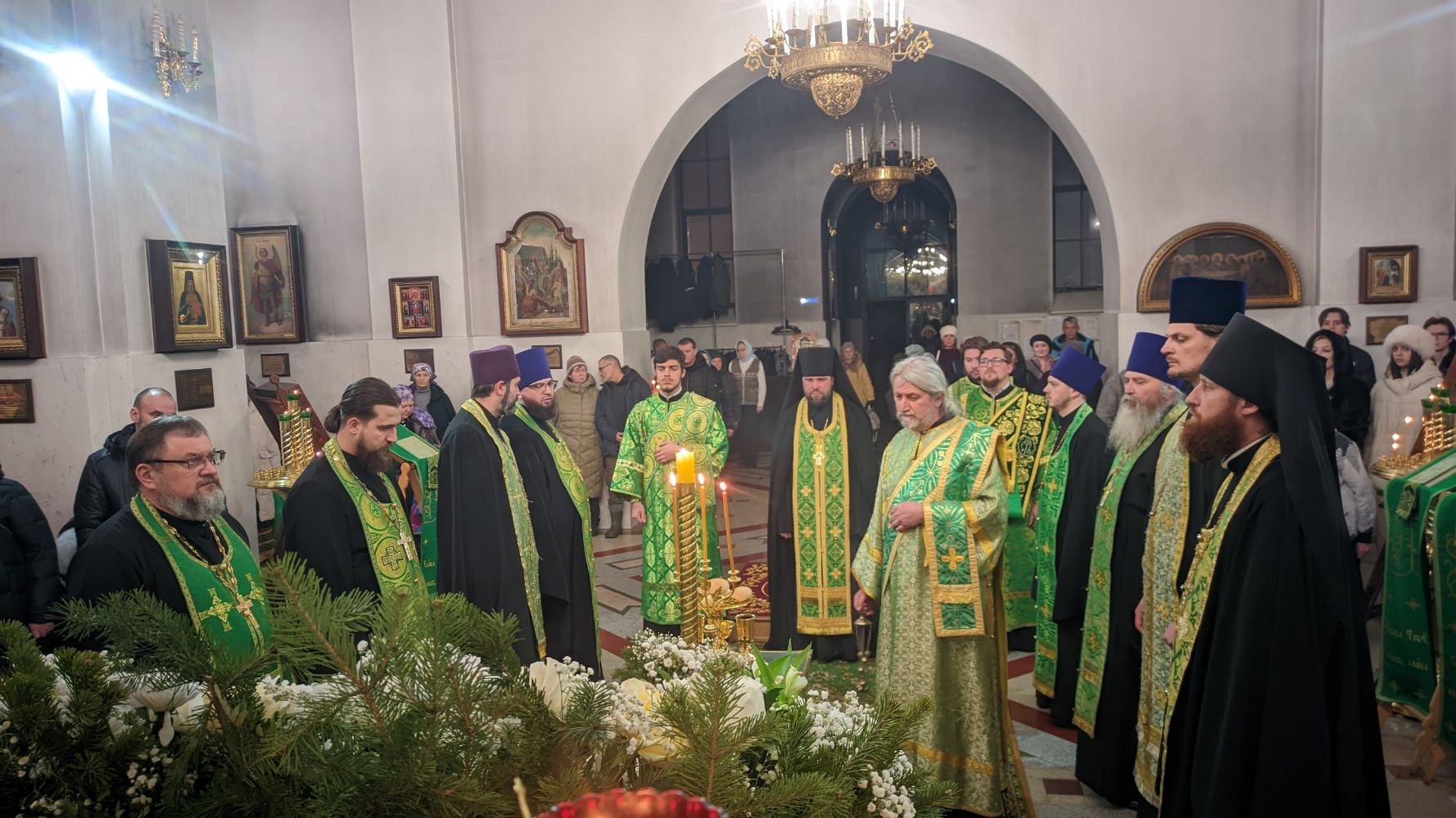 Его Высокопреосвященству сослужили благочинный Барнаульского городского округа и настоятель Александро-Невского Собора г. Барнаула протоиерей Андрей Басов, благочинный Барнаульского пригородного округа и ключарь храма святителя Николая Чудотворца г. Барнаула иерей Дионисий Рейм, ключарь храма Димитрия Ростовского г. Барнаула иеромонах Павел Журавлев, руководитель службы протокола иерей Олег Берендеев, иерей Михаил Кондратюк, иерей Вадим Гамов, иерей Николай Володин, иерей Александр Киктенко, диакон Олег Вихлянов и диакон Сергий Соколов и духовенство собора.