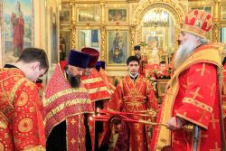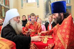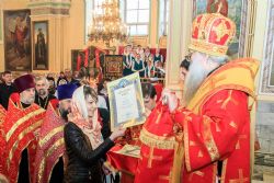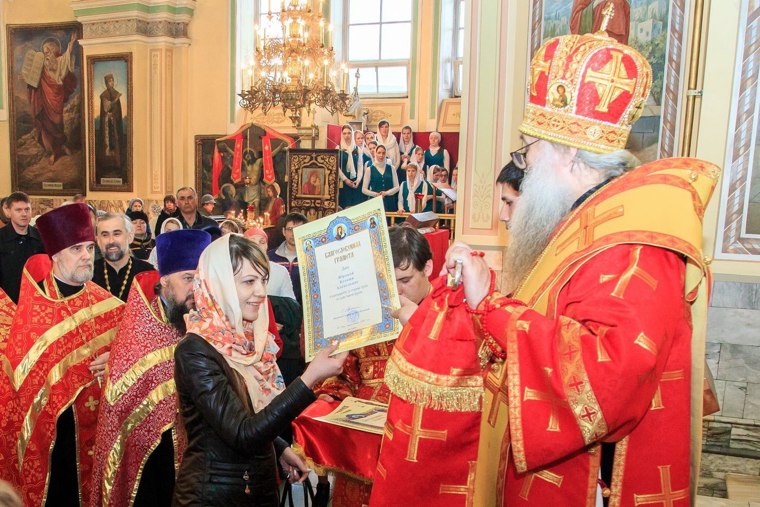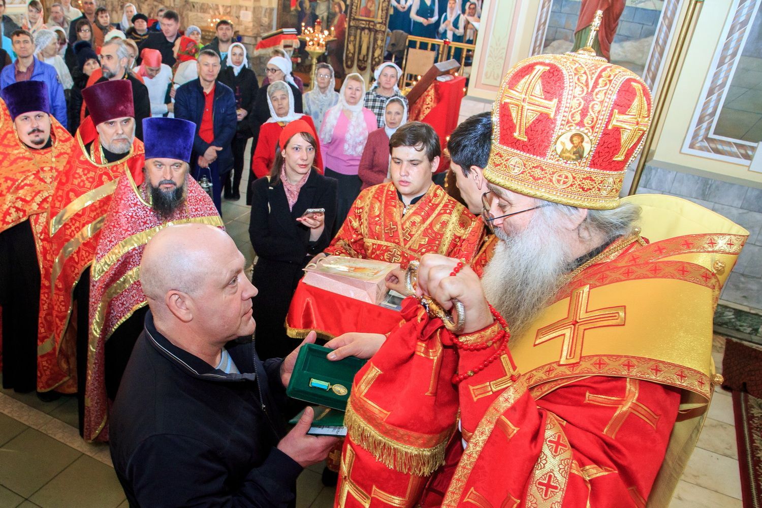 В завершение богослужения глава Алтайской митрополии вручил ряду мирян и благотворителей, особо потрудившихся на благо Церкви, медали святителя Макария Алтайского, а также Патриаршие и архиерейские грамоты и благодарственные письма.