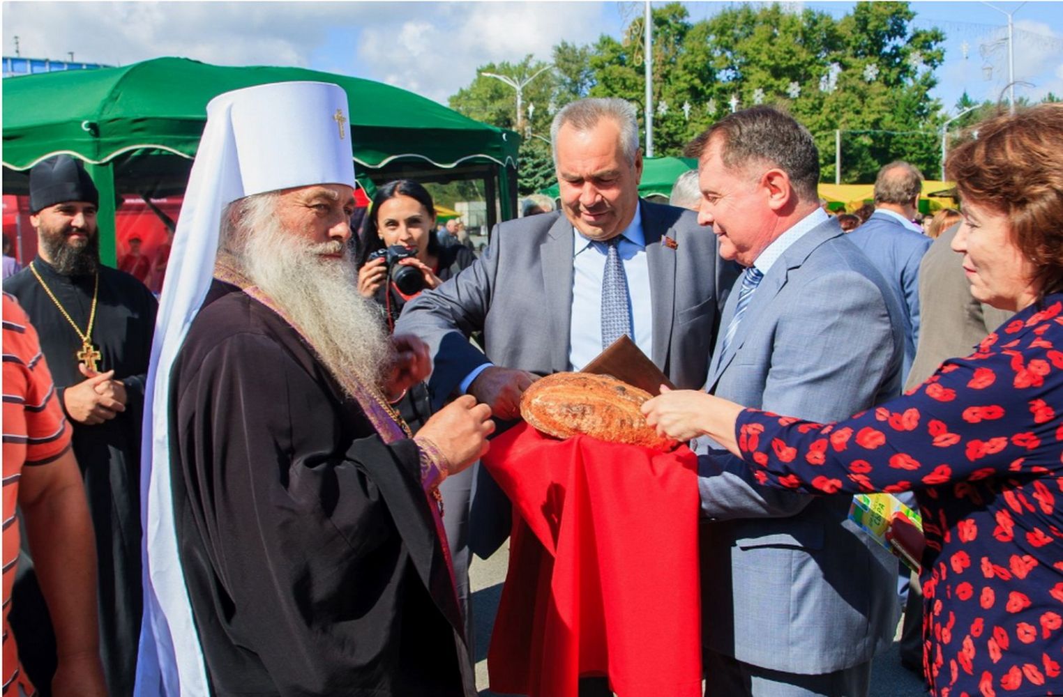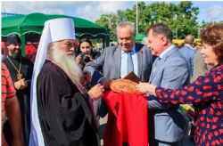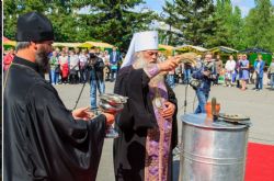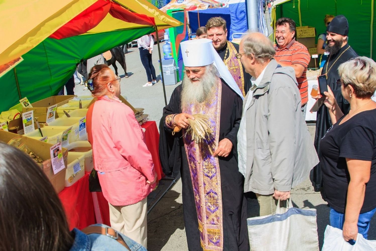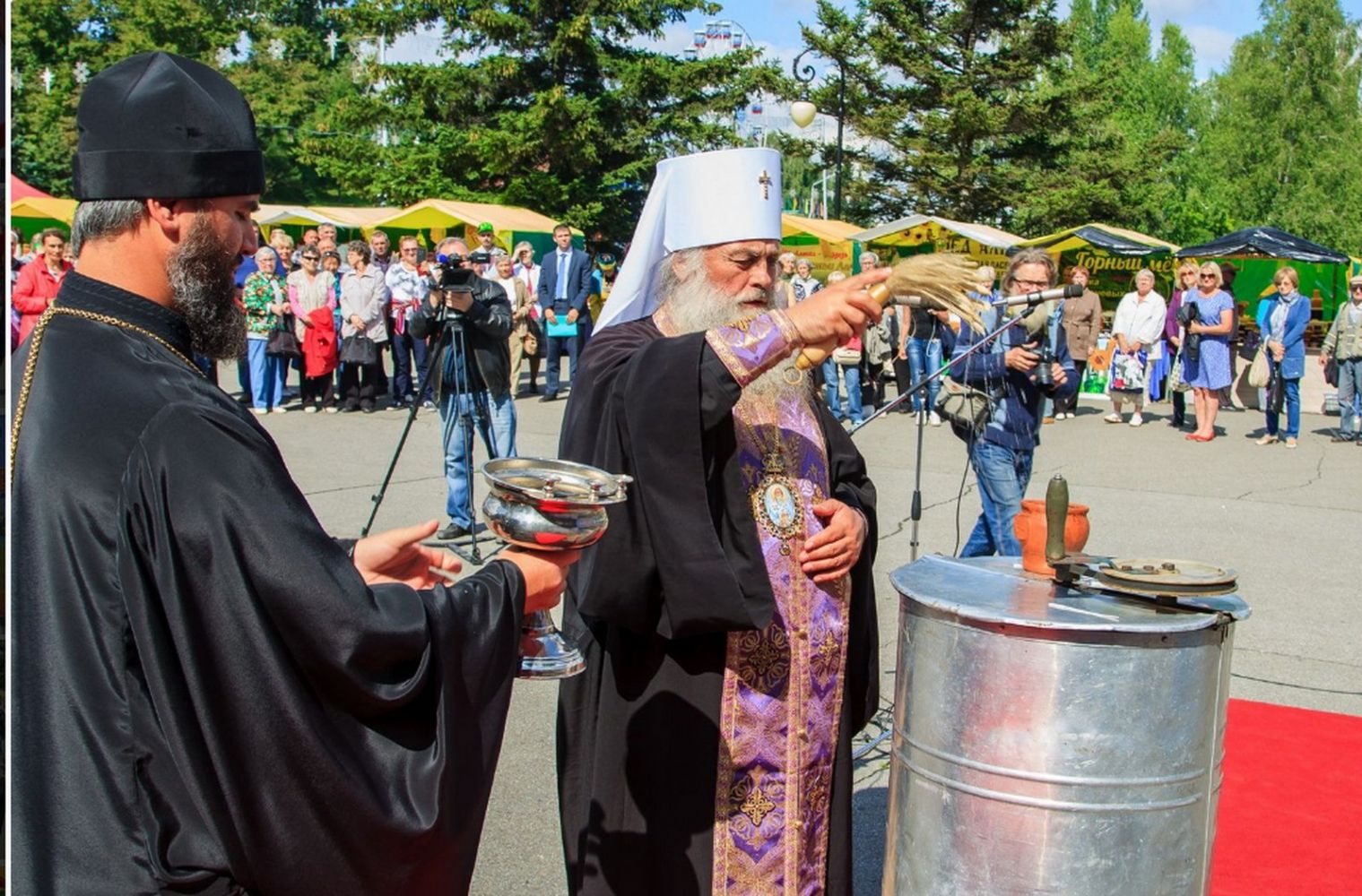Затем состоялся водосвятный молебен, который совершил Высокопреосвященнейший митрополит Сергий. После чего архипастырь и священнослужители прошли по кругу и освятили «медовые приношения» участников праздничной ярмарки.