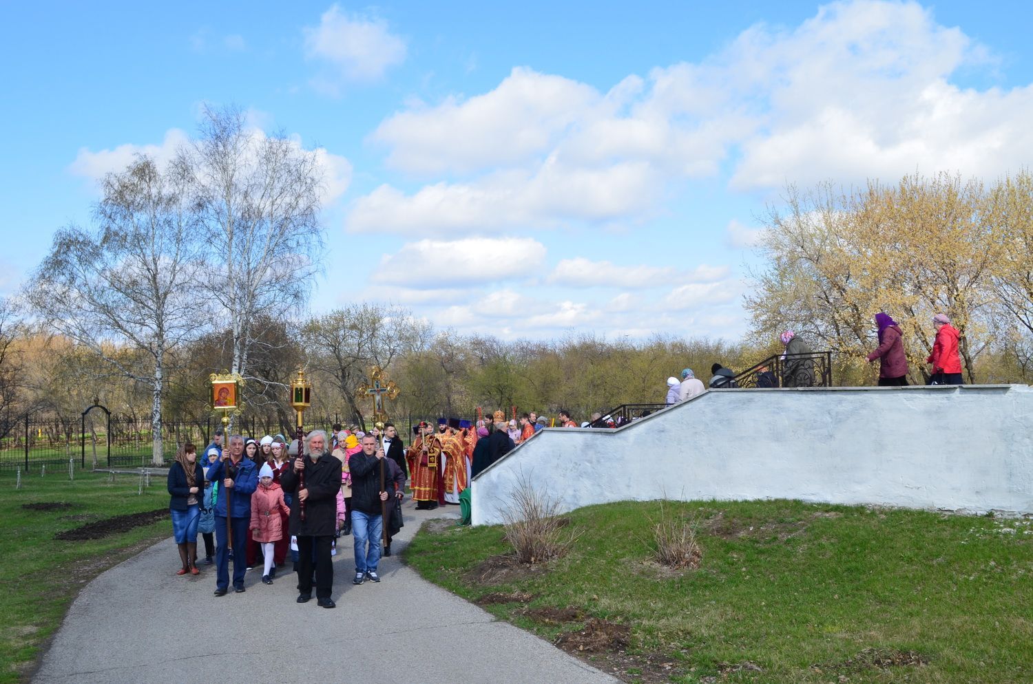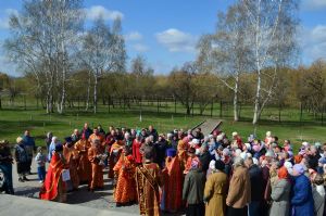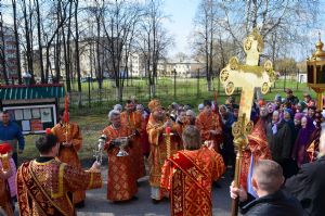 В завершение праздничного богослужения духовенство и верующие совершили крестный ход вокруг храма и славление перед иконой великомученика Георгия Победоносца.