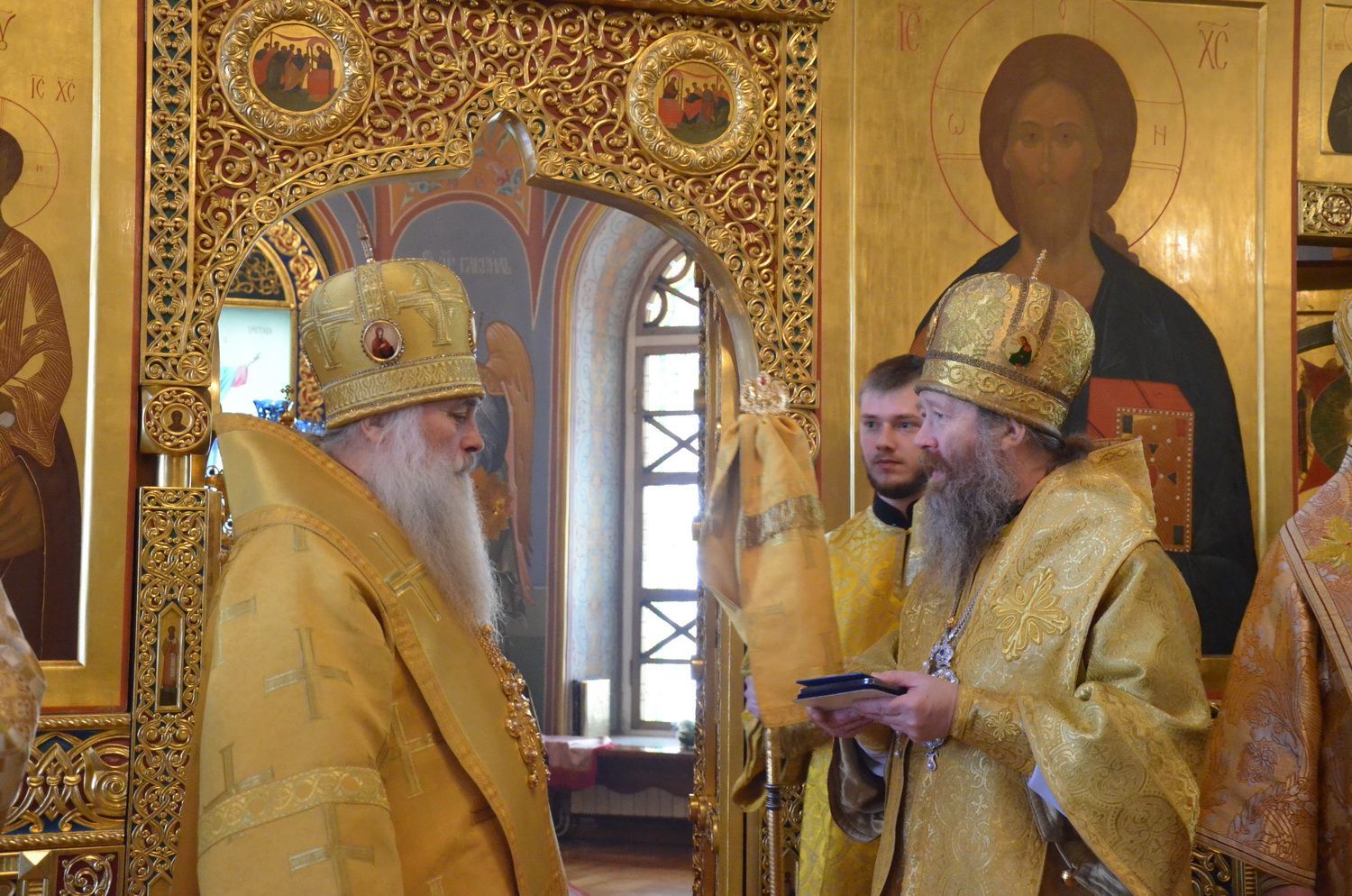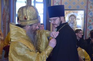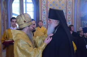 Далее Его Высокопреосвященство обратился к митрополиту Сергию и епископу Амфилохию со словами благодарности и преподнёс им памятные юбилейные медали.