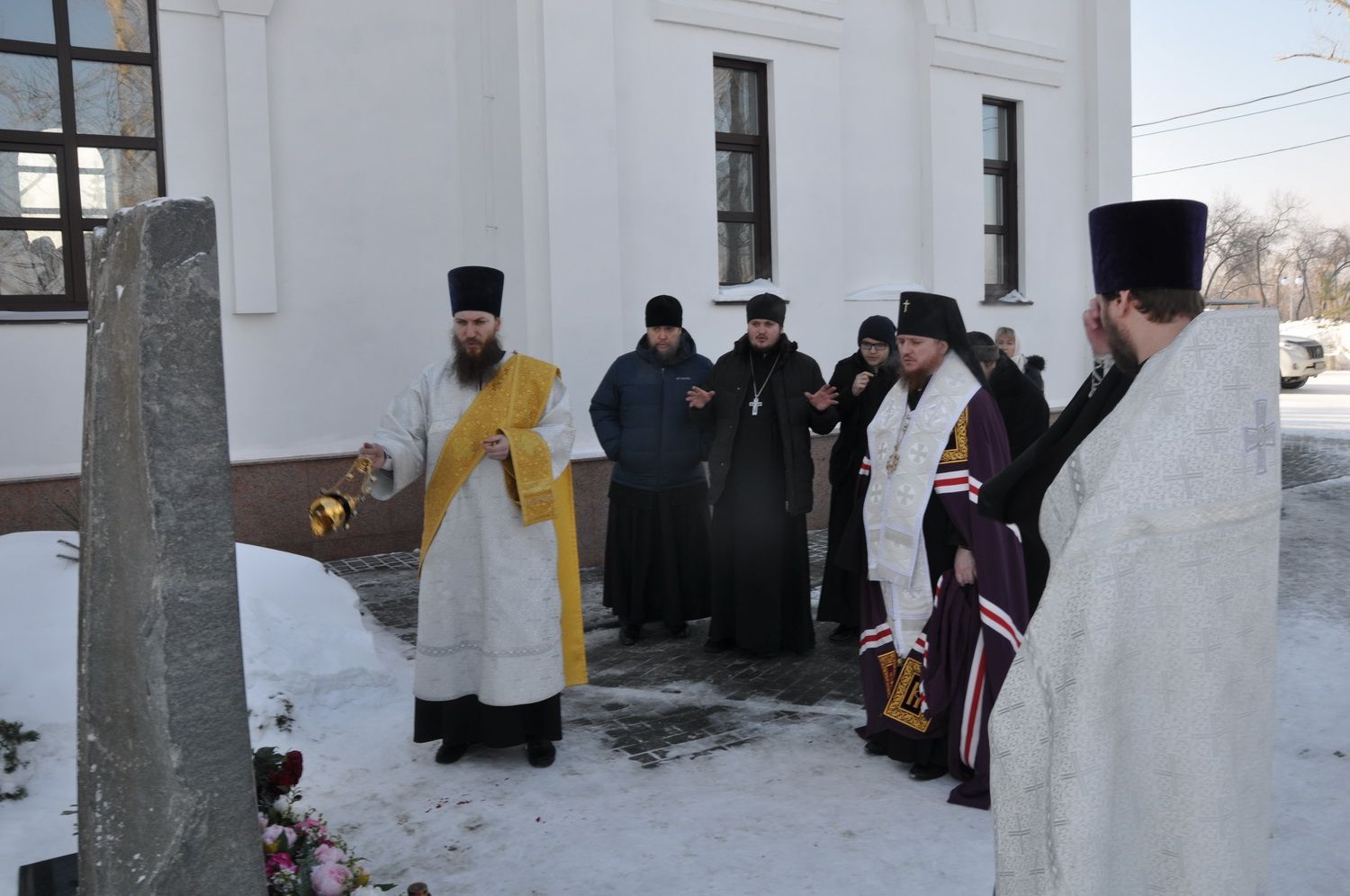 Затем молитвы были вознесены возле памятного камня. В присутствии духовенства, родственников и друзей поминаемого архиепископ Горноалтайский и Чемальский Каллистрат совершил заупокойную литию.