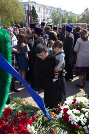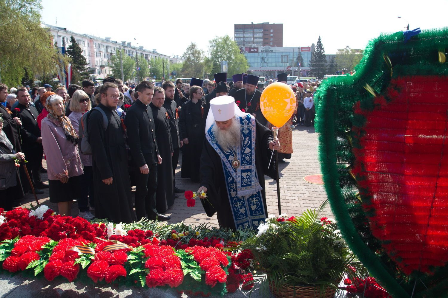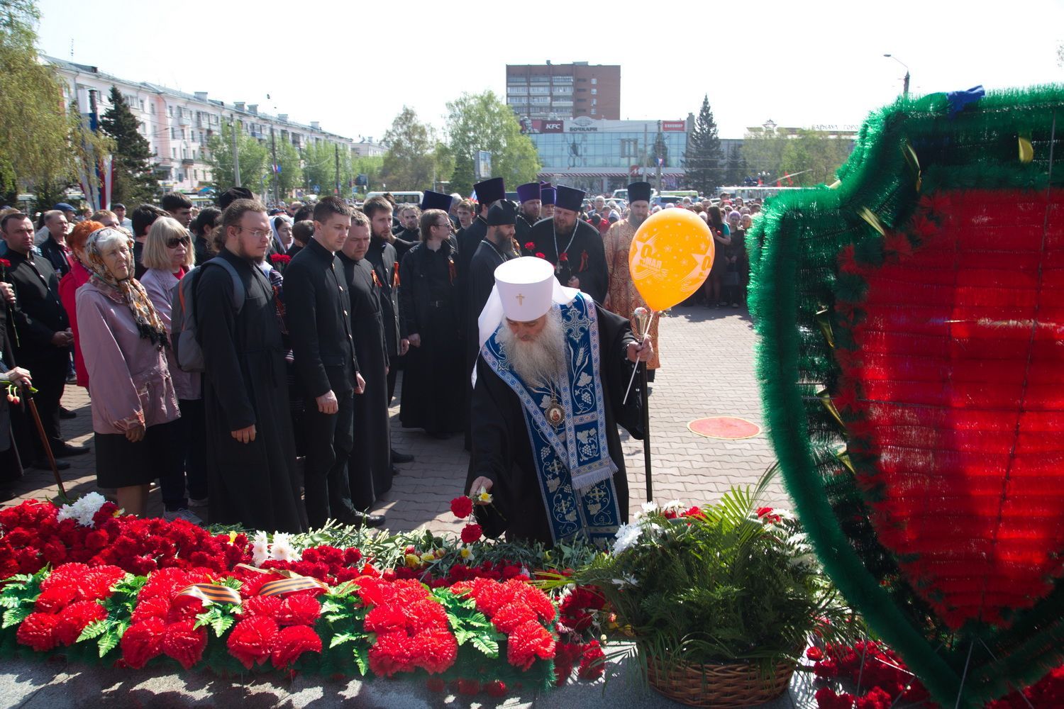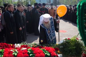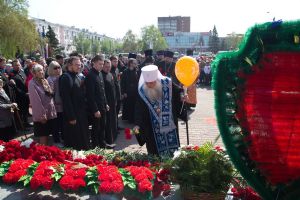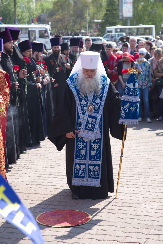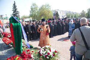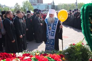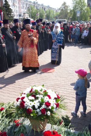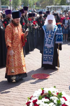 По окончании панихиды священнослужители возложили цветы к памятнику. Владыка Сергий поздравил всех с Днем Победы и сказал, что необходимо бережно хранить память о подвиге нашего народа в годы войны.