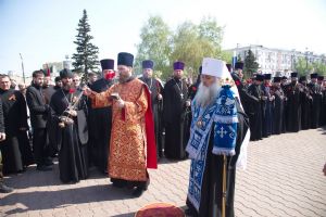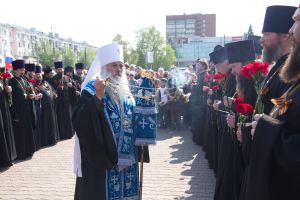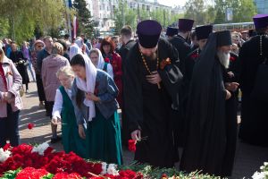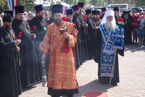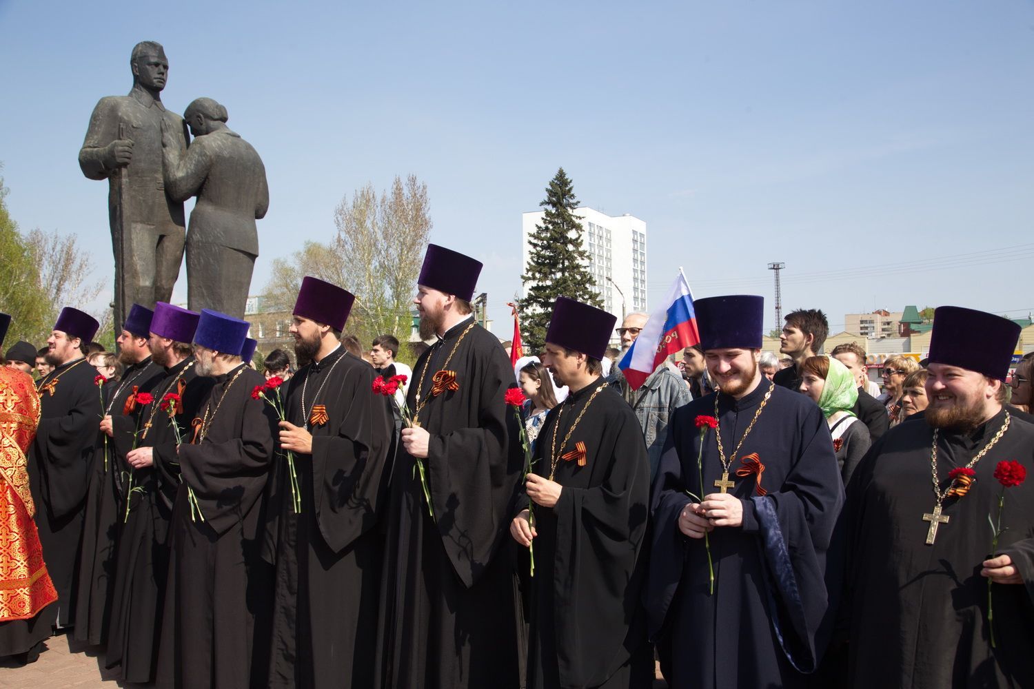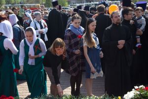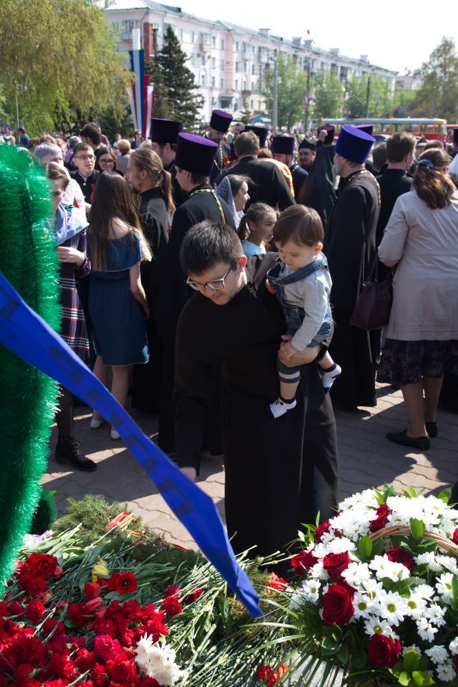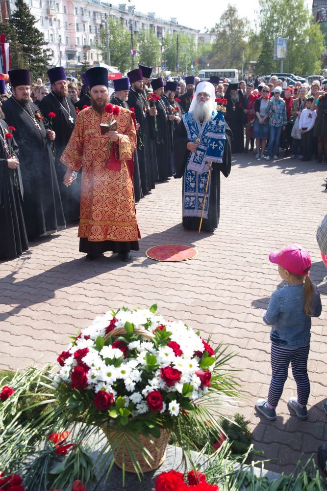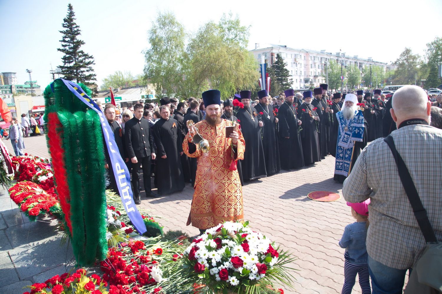По окончании панихиды священнослужители возложили цветы к памятнику. Владыка Сергий поздравил всех с Днем Победы и сказал, что необходимо бережно хранить память о подвиге нашего народа в годы войны.