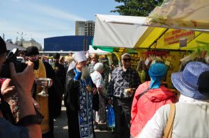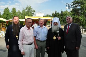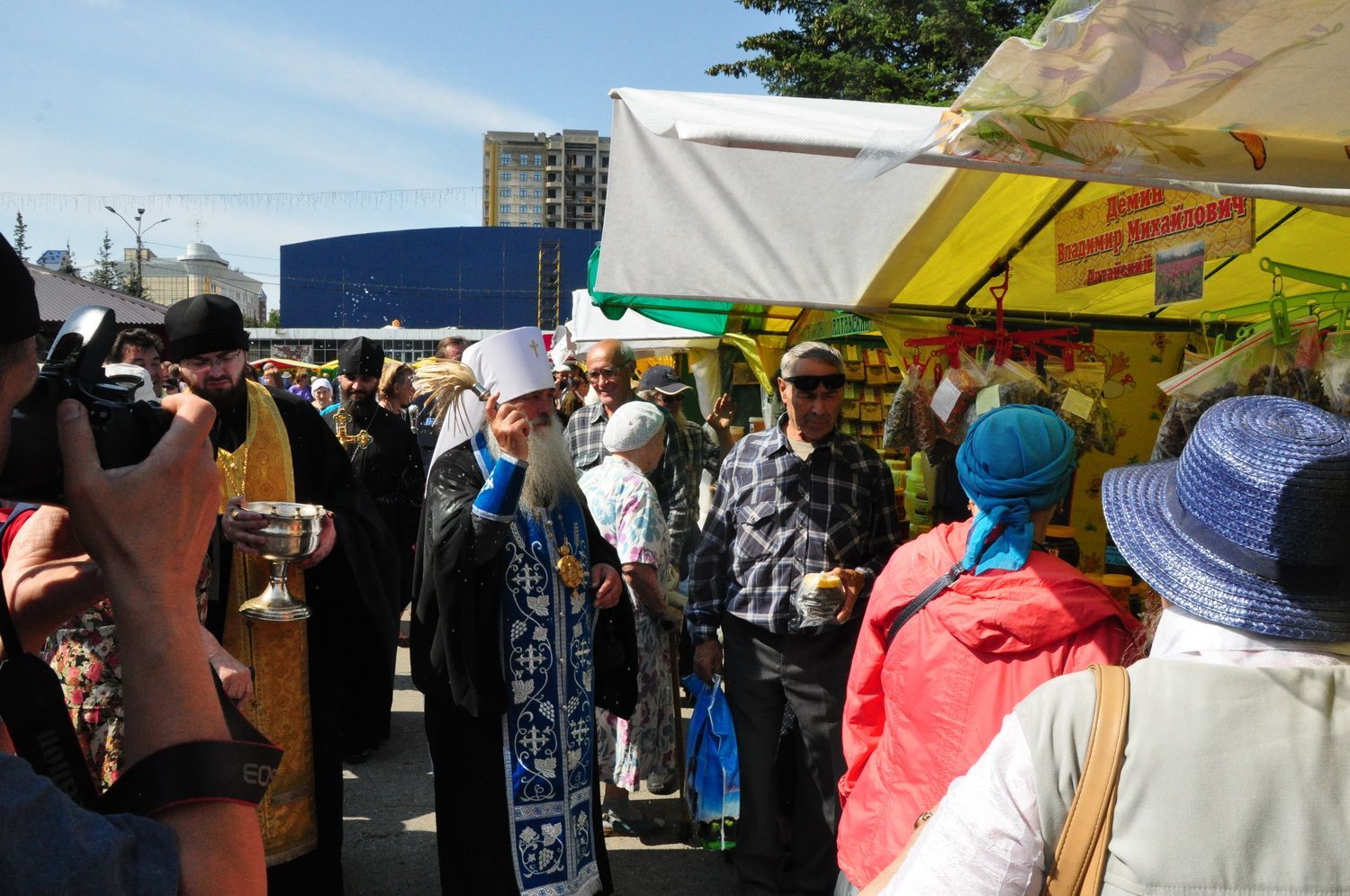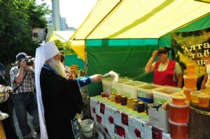 Владыка окропил святой водой все торговые палатки, а в приветственном слове подчеркнул, что пчела – Божье создание, которое трудится несмотря ни на что и летит вверх, к солнышку и цветущим травам. Так же и мы должны постоянно трудиться и совершенствоваться, уповая на волю Господа нашего Иисуса Христа. Также он поздравил всех с началом Успенского поста, который продлится до 28 августа.