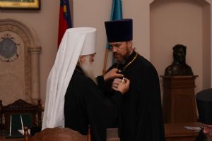 Далее митрополит Сергий вручил почетный знак ИППО «Орден Великого Князя Сергея Александровича» действительному члену Алтайского отделения ИППО протоиерею Андрею Басову. Председатель отдела по церковной благотворительности и социальному служению Барнаульской епархии протоиерей Михаил и его супруга председатель совета жен священнослужителей, руководитель епархиального гуманитарного центра помощи населению Бень Е. С. были награждены медалью святого праведного Филарета Милостивого II степени.