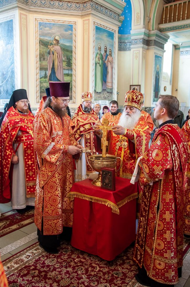 После отпуста Литургии владыка Сергий совершил малое освящение воды и окропил предстоящих богомольцев.