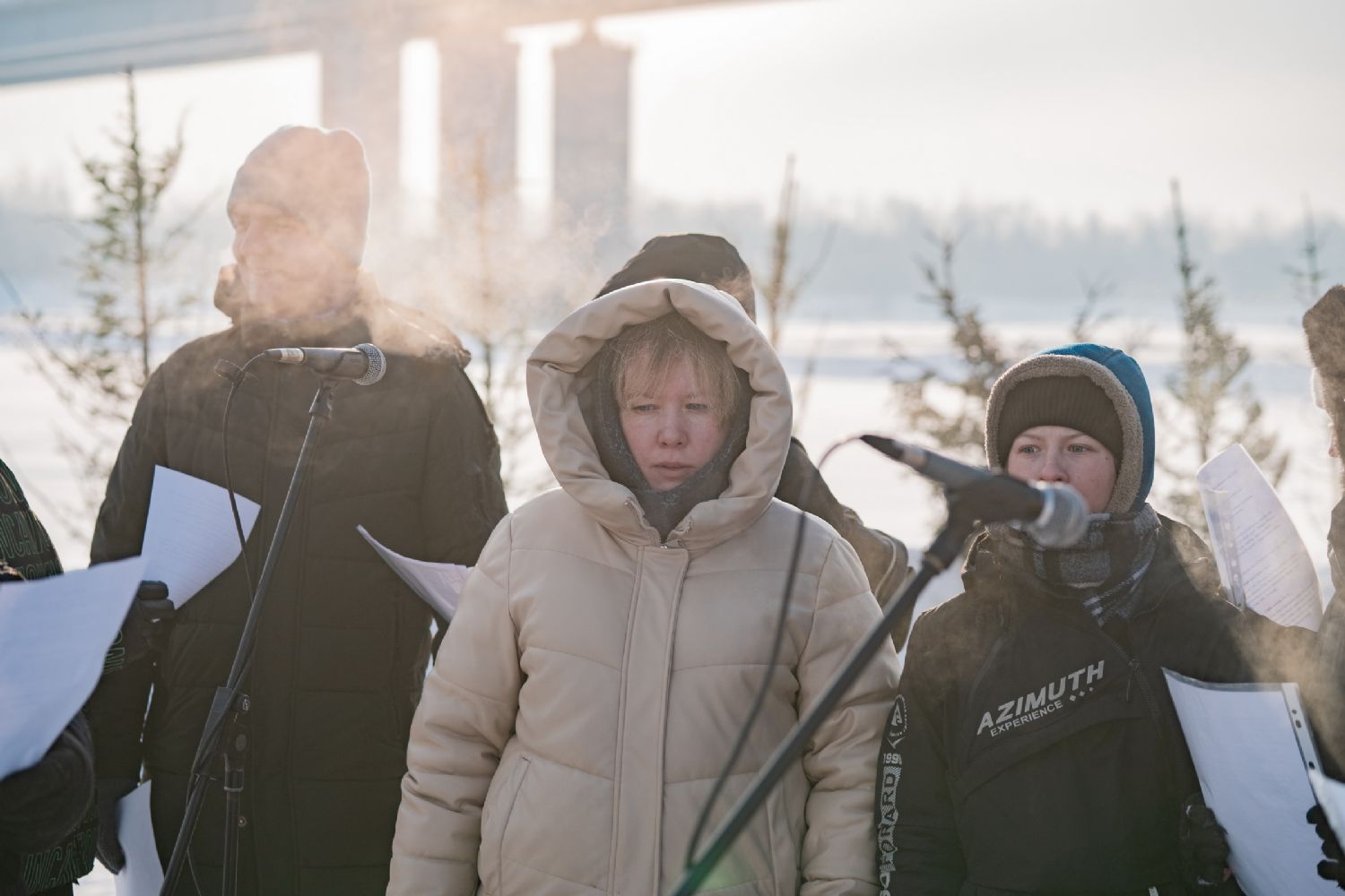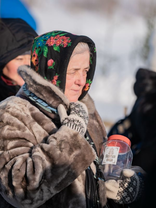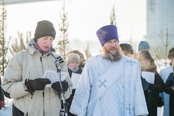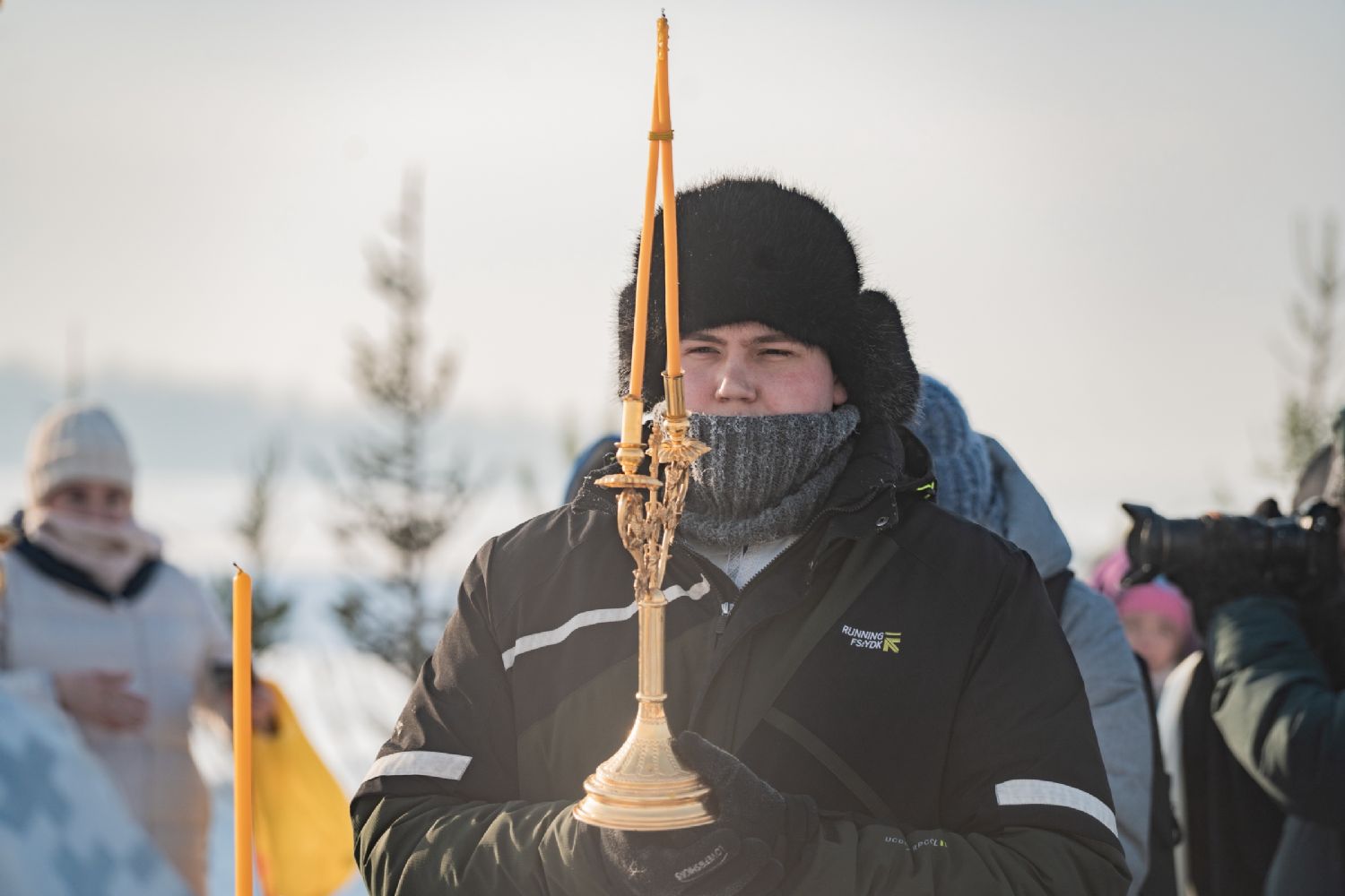 На берегу Оби городские власти построили снежную часовню, а прямо на льду реки расчистили от снега просторную площадку, огородили ее снежным валом и елочками. На площадке поставили большой ледяной крест выше человеческого роста, во льду прорубили в виде креста иордань для освящения воды, а неподалеку построили купель в виде деревянных ступенек, сходящих в воду, с перилами, для купания в крещенской воде. На месте в целях обеспечения безопасности дежурили спасатели. Рядом с купелью поставили две синие будки для переодевания братьев и сестер, желающих совершить погружение. Кроме священнослужителей, выстроившихся на льду двумя шеренгами, здесь присутствовали хоругвеносцы, журналисты, казаки, врачи и сотрудники полиции. Остальные участники крестного хода в целях безопасности остались на берегу.