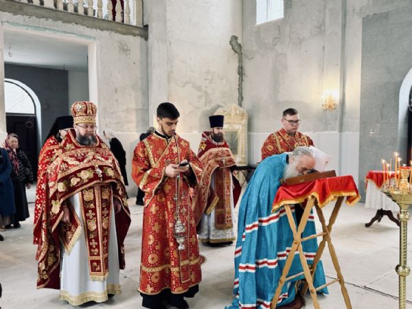 В понедельник Светлой седмицы Владыка Сергий совершил Литургию в строящемся Спасском соборе г. Барнаула