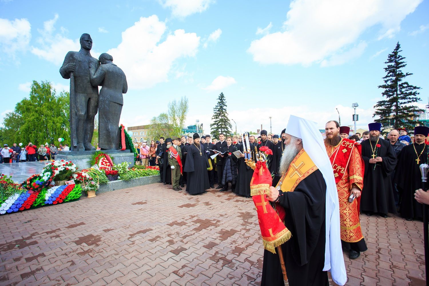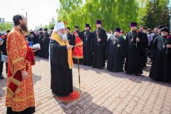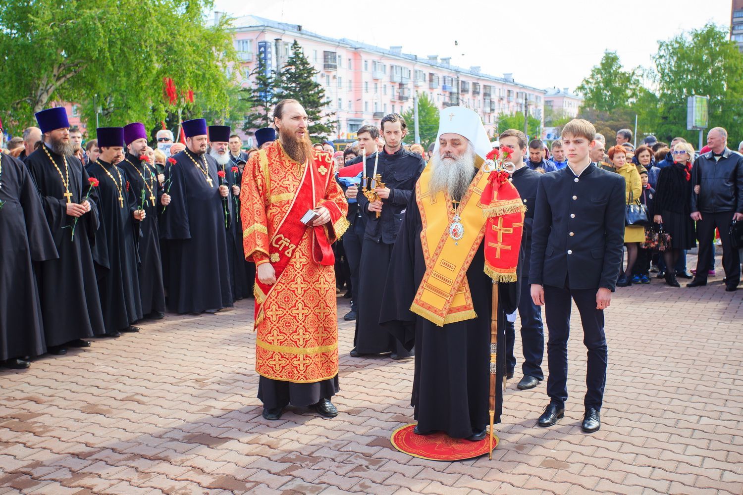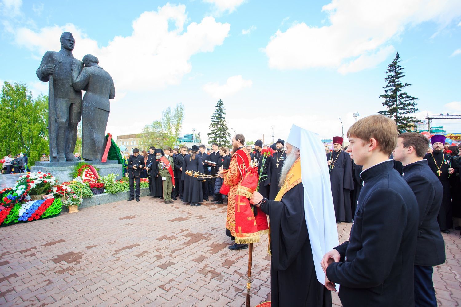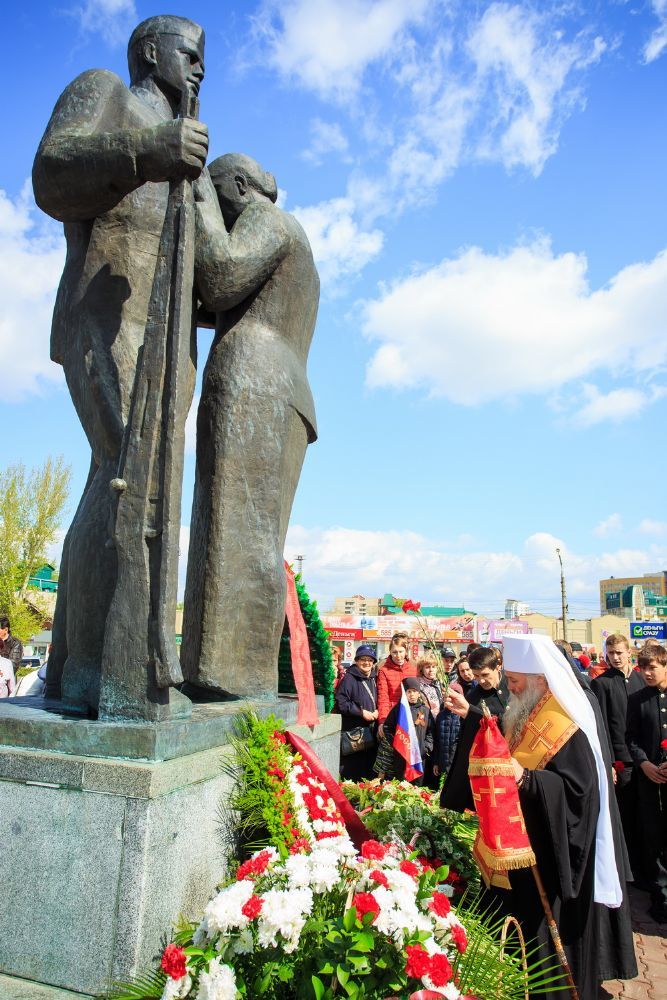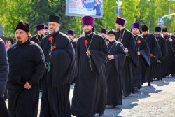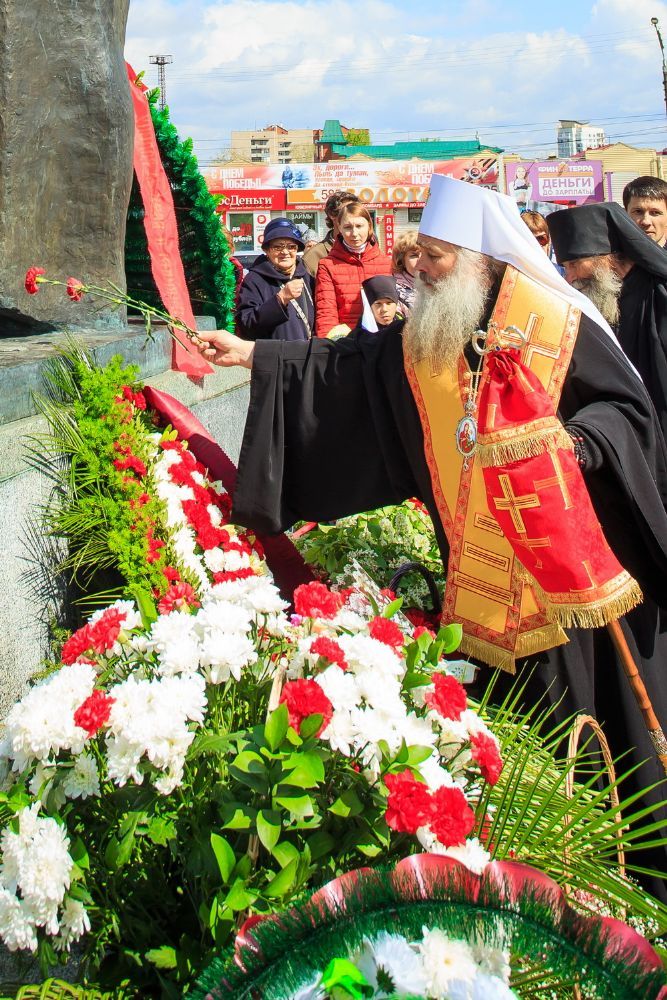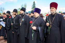 По окончании заупокойного богослужения священнослужители пропели тропарь праздника Пасхи, а глава Алтайской митрополии обратился к собравшимся со словами поздравления по случаю Дня Великой Победы.