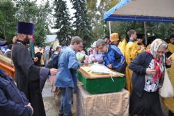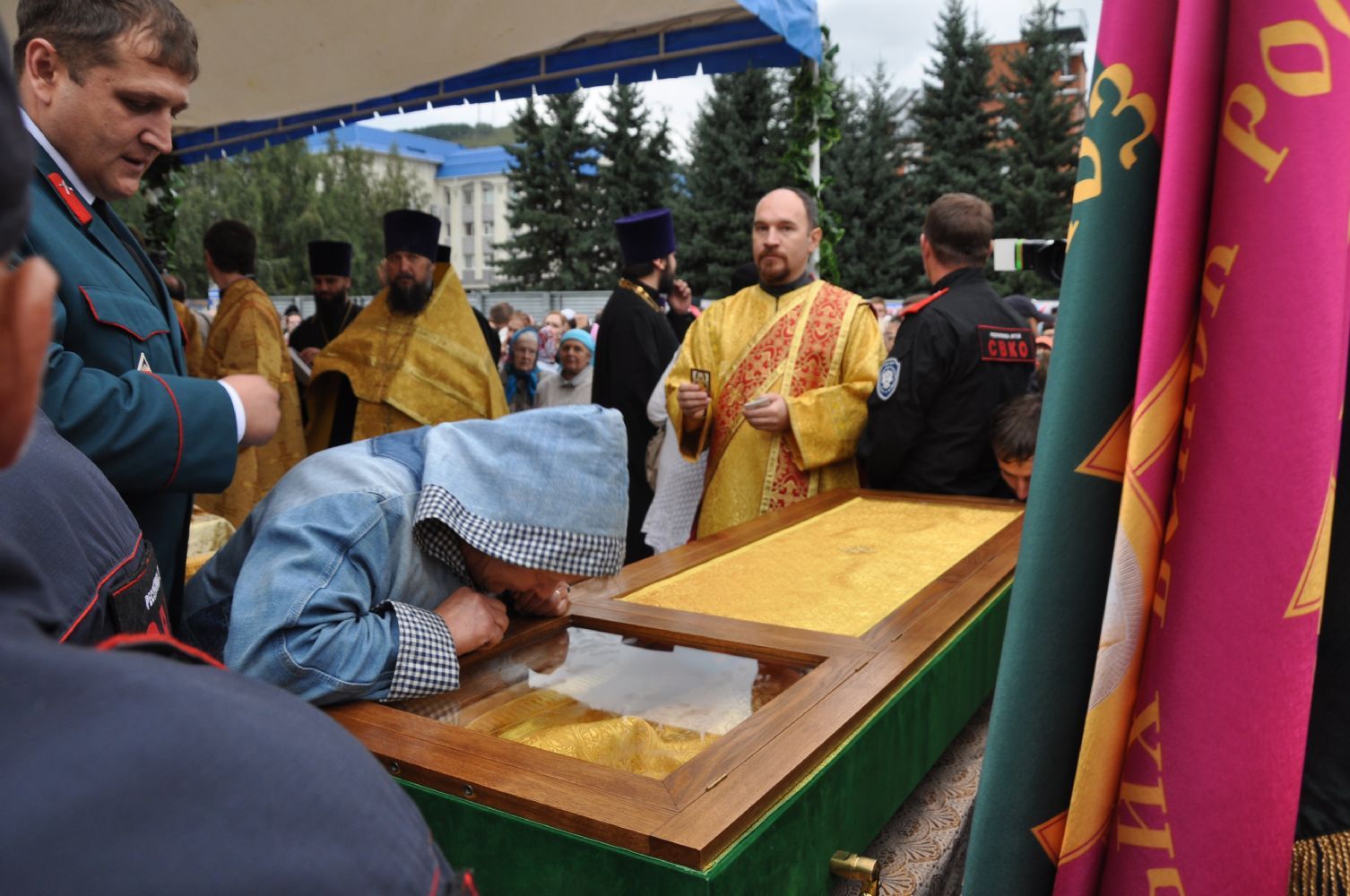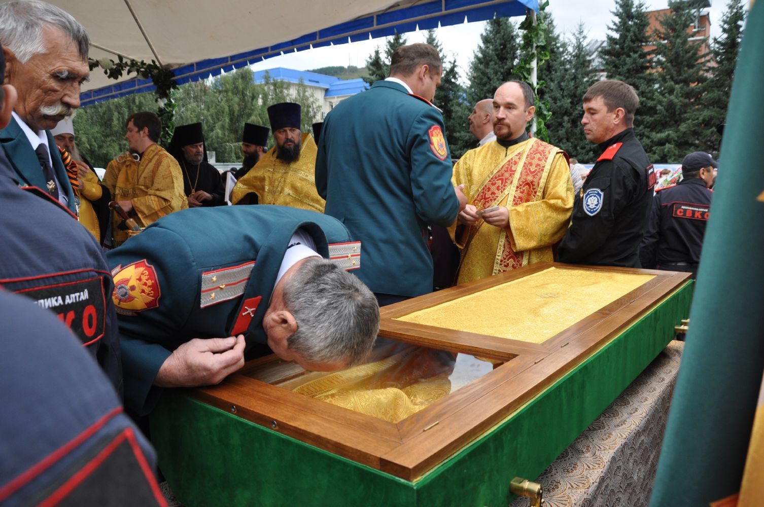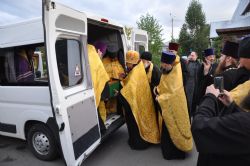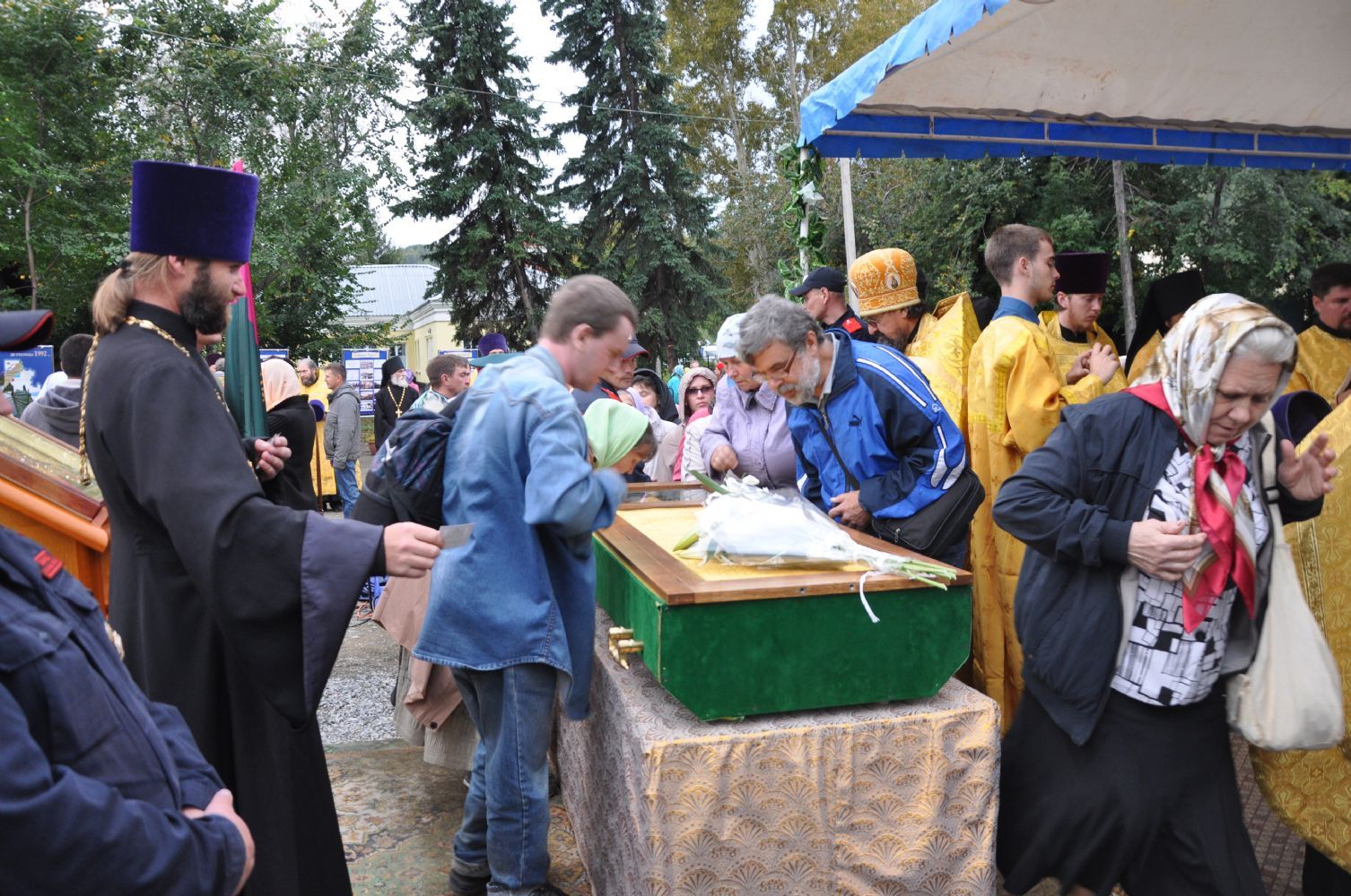 После того, как все присутствующие (а это около тысячи человек) приложились к мощам и получили на память иконку с изображением Святителя, раку торжественно перевезли в Макариевский храм Горно-Алтайска.