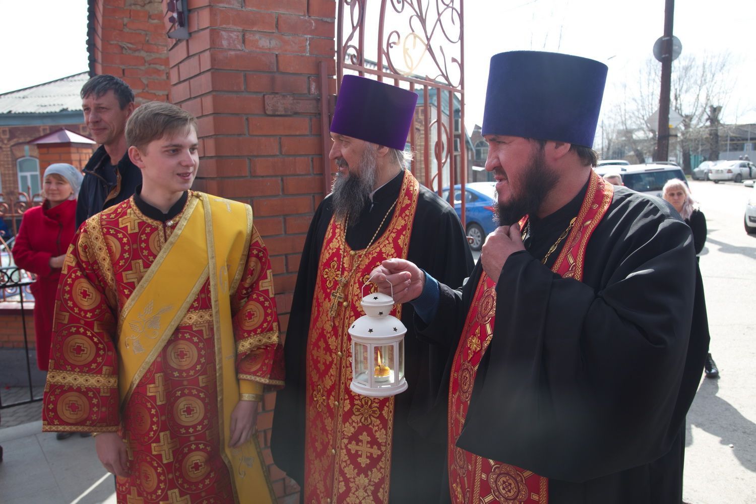 Перед началом праздничного богослужения в собор был принесен Благодатный огонь, который был доставлен из иерусалимского Храма Воскресения Христова (Гроба Господня).