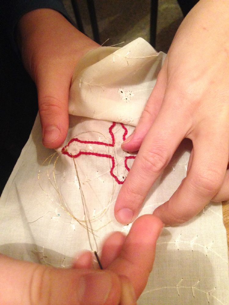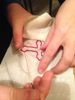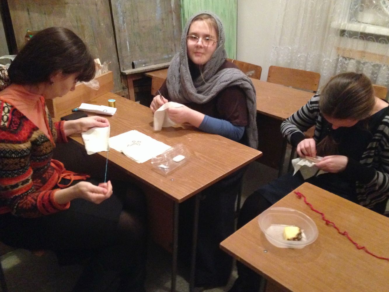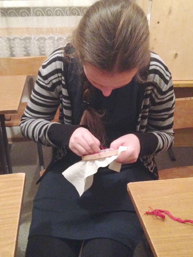 За окном вьюга,холодный ветер. А у нас за шитьем тепло и хорошо! Продолжается подготовка к ярмарке. Ответственный момент: вышивание изображения креста на мешочках для просфор.