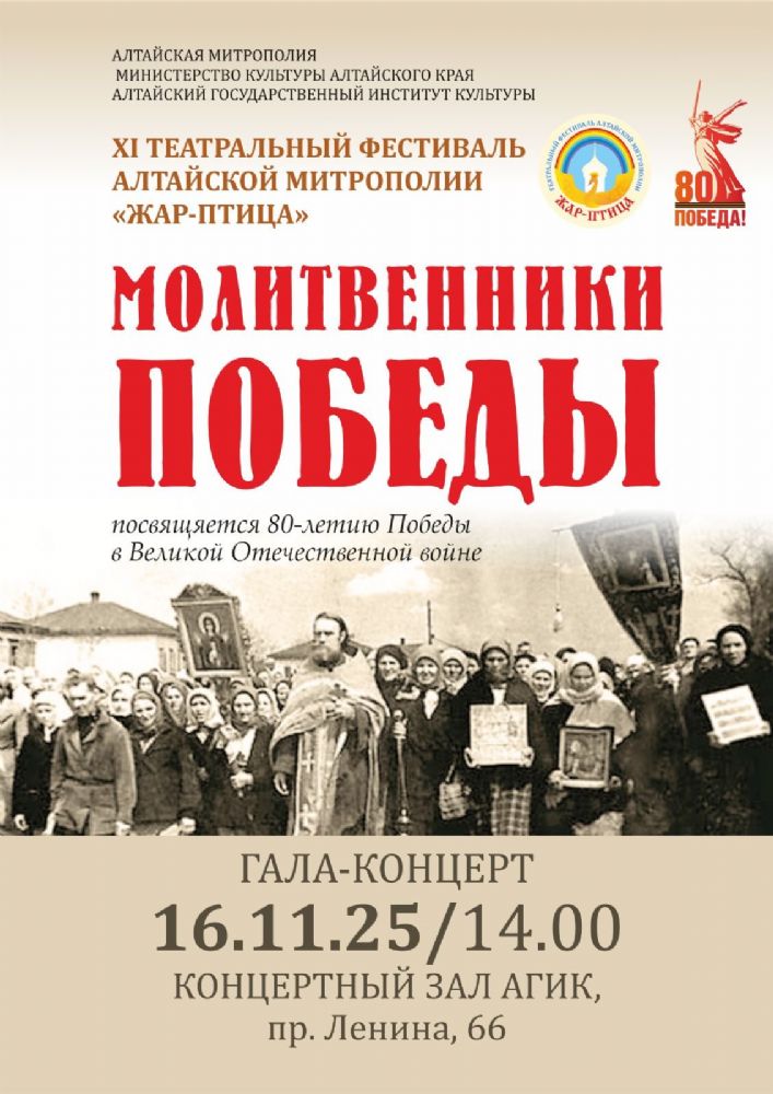 Мероприятие прошло в рамках XI фестиваля театрально искусства «Жар-Птица» алтайской митрополии, посвященного 80-летию Великой Победы. В год юбилея особенно значимо вспомнить тех, кто способствовал победе не только на полях сражений, но и в подвиге непрестанной молитвы. Преподобный Серафим Вырицкий, чей образ был явлен на сцене, — один из таких молитвенников, чьей верой был огражден наш народ в годы испытаний.
