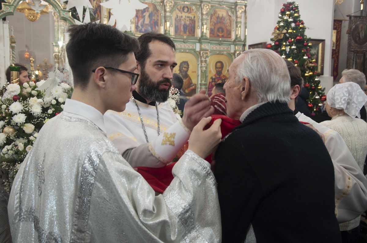 После пения запричастного стиха, перед причащением мирян, протоиерей Андрей Басов огласил Рождественское послание Святейшего Патриарха Московского и всея Руси Кирилла архипастырям, пастырям, монашествующим и всем верным чадам Русской Православной Церкви.