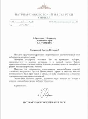 Патриарх Московский и всея Руси Кирилл направил в адрес Виктора Томенко поздравление с избранием на ответственный пост Губернатора Алтайского края. Его послание зачитал Глава Алтайской Митрополии Митрополит Сергий.